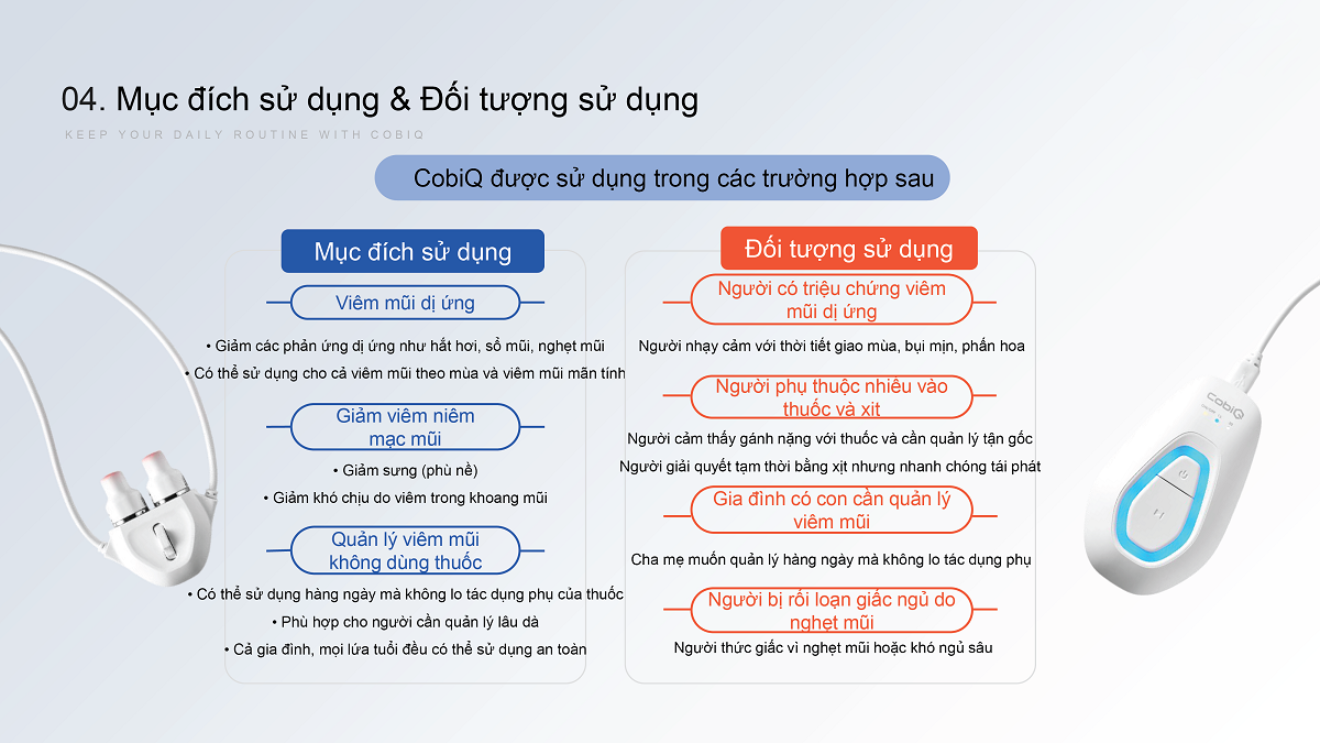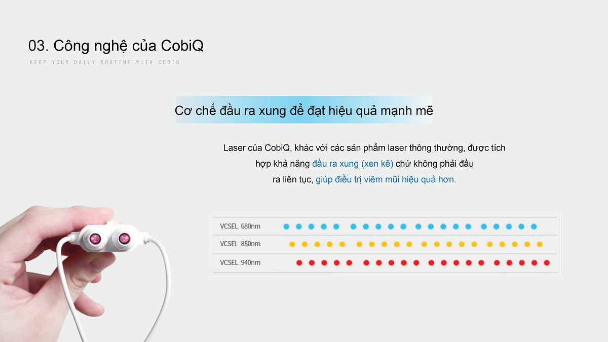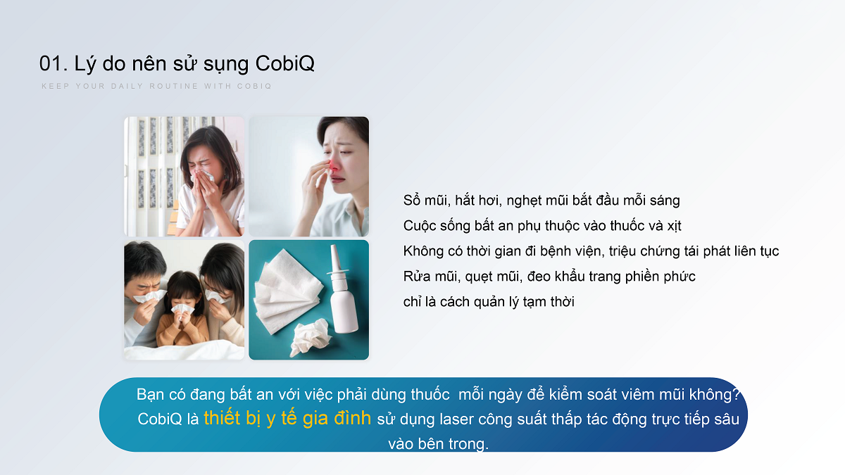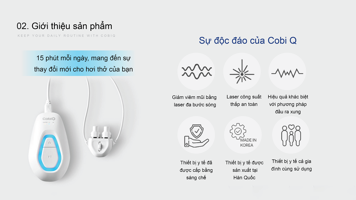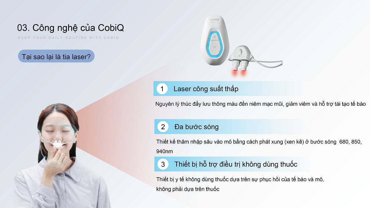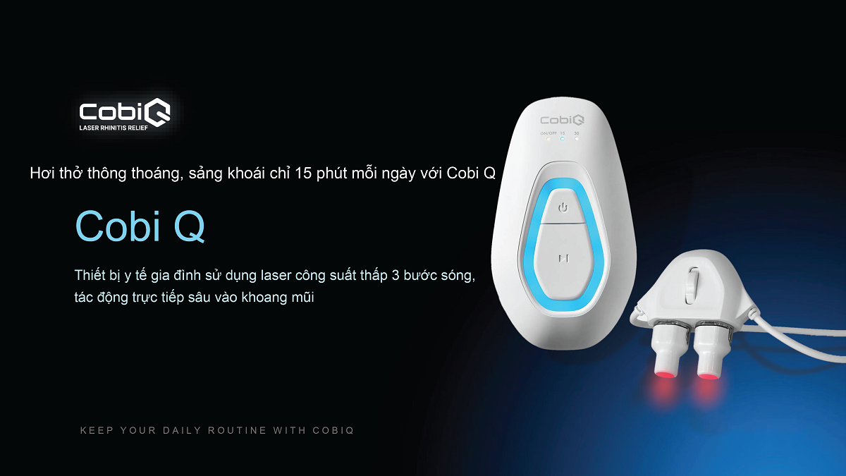 Giải pháp chăm sóc đường hô hấp tại nhà, ứng dụng công nghệ laser đa bước sóng, hỗ trợ giảm viêm niêm mạc mũi và cải thiện hô hấp tự nhiên, không dùng thuốc. Hơi thở thông thoáng, sảng khoái chỉ 15 phút mỗi ngày với Cobi Q.