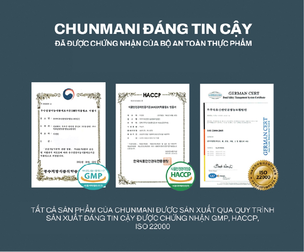 - Nhà máy sản xuất Chunmani: Với hơn 23 năm trong lĩnh vực sản xuất và thực phẩm bảo vệ sức khỏe. Chunmani đã xây dựng một quy trình sản xuất nghiêm ngặt và tuân thủ các tiêu chuẩn cao.